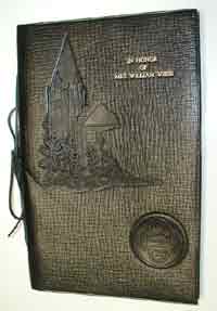 | The booklet honoring Mrs. William Wiess, recording the addresses delivered at Southwestern University, Georgetown, Texas, Tuesday, June 18, 1937. It is bound in black leather (not brown as indicated by the photograph), the pages being tied into it with a thin leather cord. Impressed on the cover are the images of the Southwestern main building and of the university seal, along with the title "IN HONOR OF MRS. WILLIAM WIESS" in gold leaf. | < |